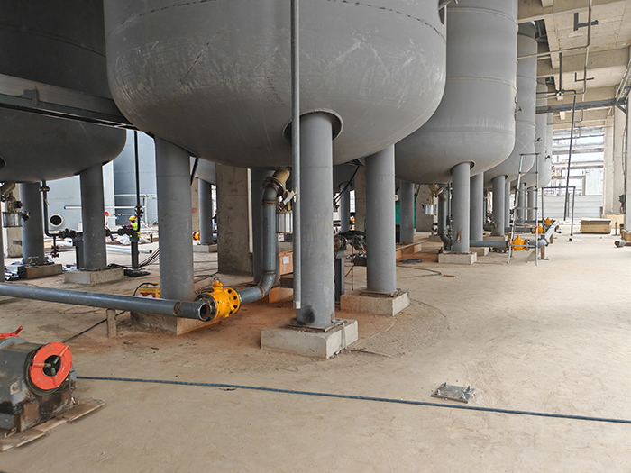 此外,硫化尾氣風(fēng)機(jī)已經(jīng)順利就位,并正在加緊安裝。風(fēng)機(jī)的安裝過程涉及精確的調(diào)試和校準(zhǔn)工作,施工人員根據(jù)設(shè)計(jì)要求,對(duì)風(fēng)機(jī)的水平度、垂直度等關(guān)鍵參數(shù)進(jìn)行嚴(yán)格控制,以確保風(fēng)機(jī)能夠正常運(yùn)行。 罐體制作情況 多硫化儲(chǔ)罐、三效工藝水儲(chǔ)罐、火堿儲(chǔ)罐和中和水儲(chǔ)罐等關(guān)鍵設(shè)備已經(jīng)制作完成。在設(shè)備制作過程中,公司嚴(yán)格按照相關(guān)的質(zhì)量標(biāo)準(zhǔn)和設(shè)計(jì)規(guī)范進(jìn)行生產(chǎn)。選用了優(yōu)質(zhì)的鋼材作為原材料,經(jīng)過下料、焊接、成型等多道工序,確保了罐體的強(qiáng)度和密封性。 精制、水洗、打漿、多硫化工序 精制、水洗、打漿、多硫化工序相關(guān)的管道和閥門正在緊鑼密鼓地進(jìn)行安裝。在管道安裝過程中,嚴(yán)格按照工藝流程進(jìn)行布置,確保物料流動(dòng)順暢。同時(shí),對(duì)閥門進(jìn)行嚴(yán)格的質(zhì)量檢驗(yàn)和調(diào)試,保證閥門的開閉靈活、密封性能良好。目前已完成大部分管道和閥門的基礎(chǔ)安裝工作。